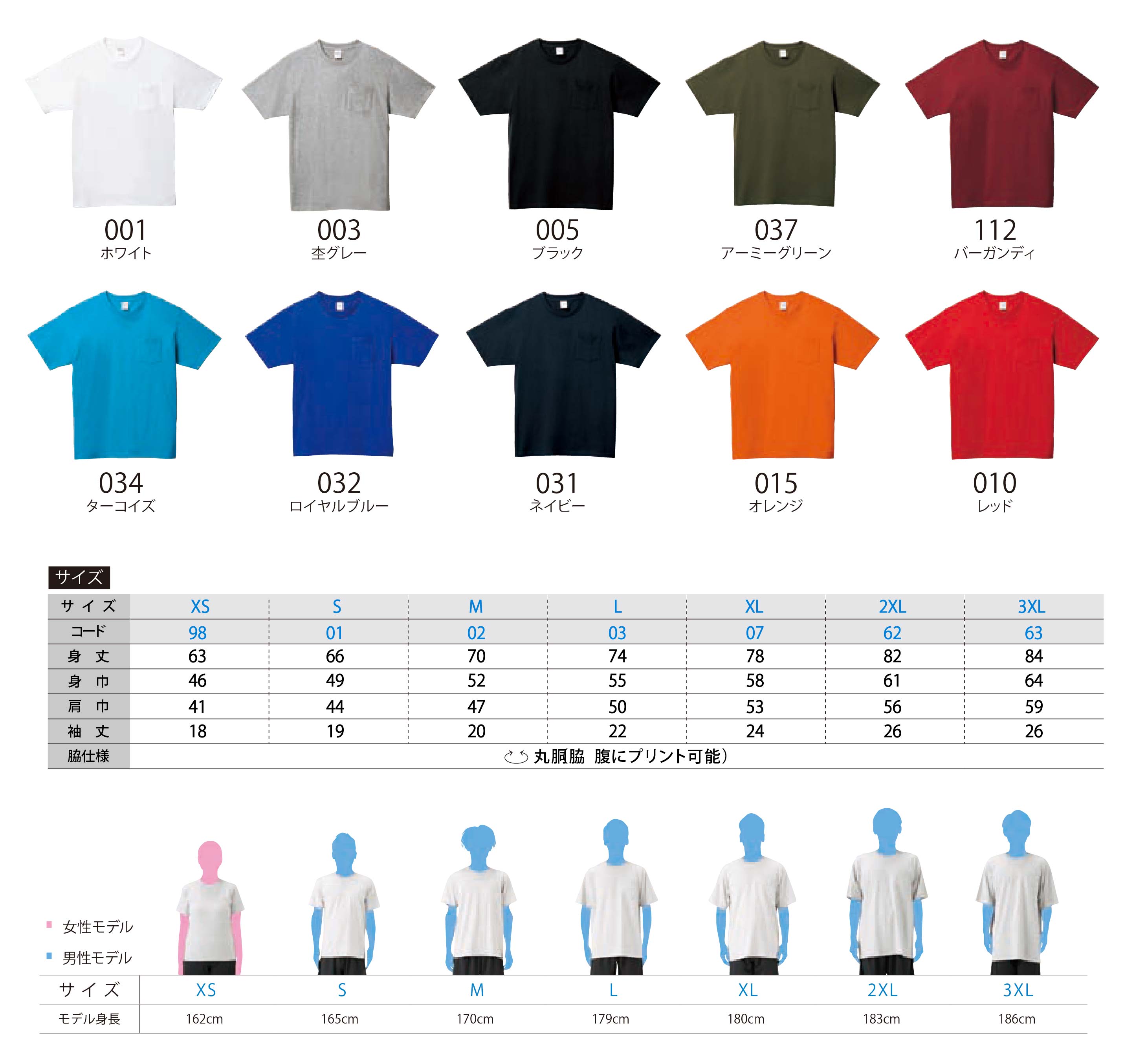 お手持ちのTシャツの着丈、身幅を測って比べていただき、ご自身に合ったサイズをお選び下さい。