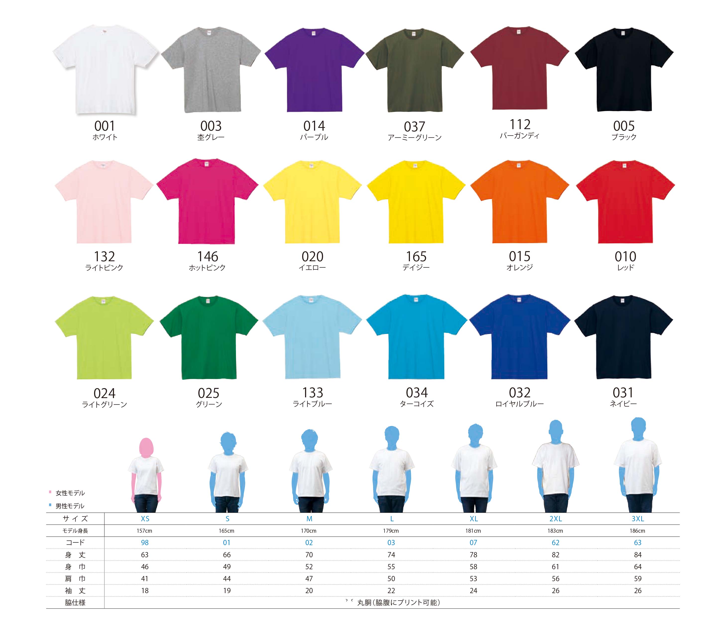 お手持ちのTシャツの着丈、身幅を測って比べていただき、ご自身に合ったサイズをお選び下さい。